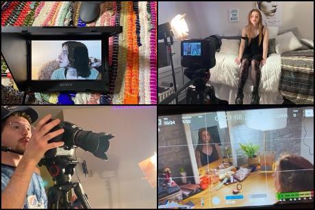 Several Muhlenberg alumni and current students have been involved in the project. Larissa Dowling ’22 and Evelyn Carlin ’24 star in the film. Mustion worked behind the camera as co-producer, writer and director; Weinberger is co-producer and editor; Goldsmith is co-producer, assistant director and production designer. Rosy Vinod ’25 is the script supervisor, Oliver Waite ’22 is the music composer and Sasson Lonner ’22 is director of photography. Gretchen D’Amato ’23 worked on sound for the film, and D'Amato, Maddi Whiting ’22 and Becca McCord ’22 all worked as cinematographers.
